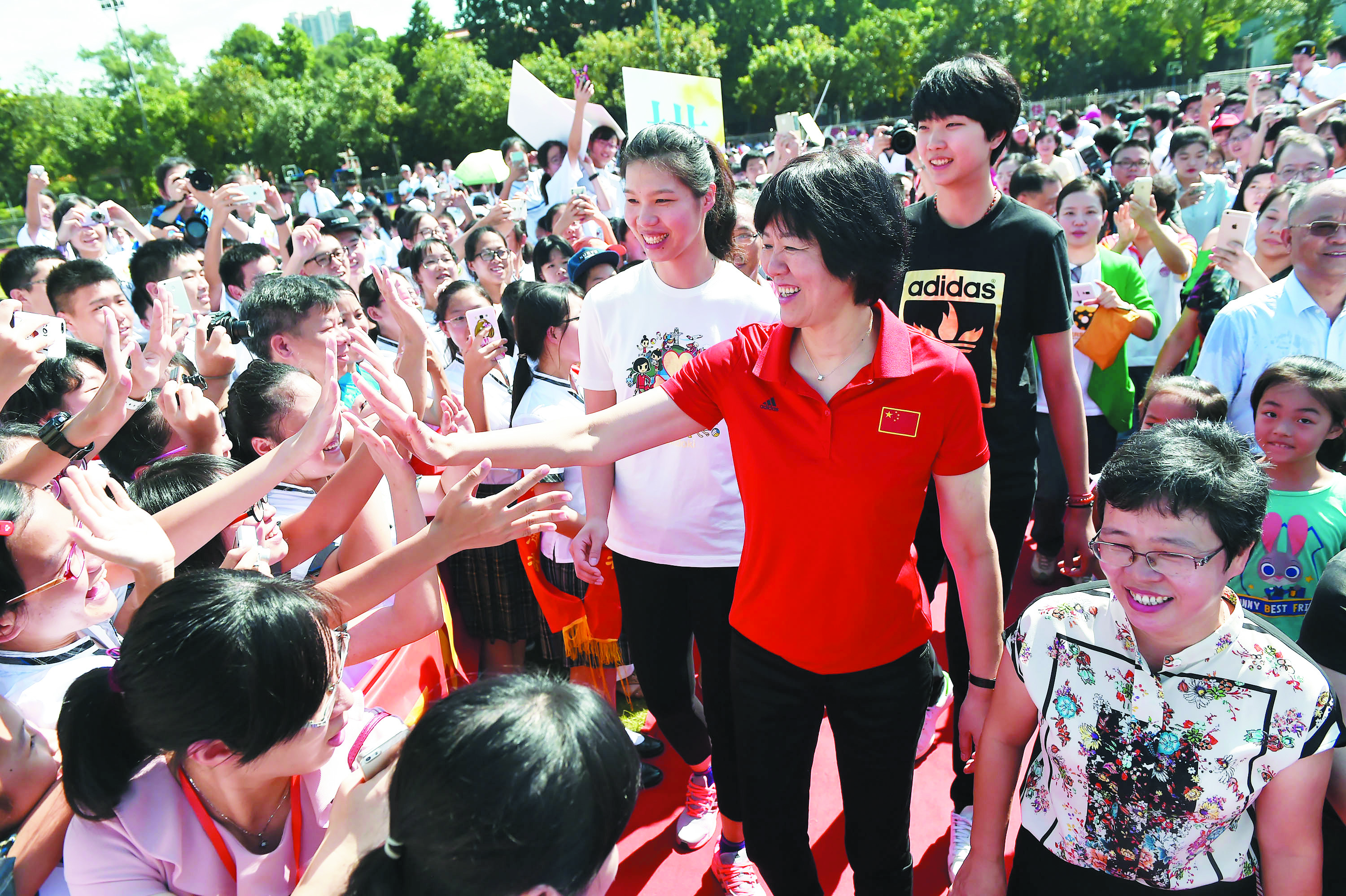 9月17日,中国女排主教练郎平与学生互动。当日,中国女排主教练郎平偕女排队员徐云丽和袁心玥来到广州市广雅中学,与师生交流互动,分享排球带来的快乐。新华社发