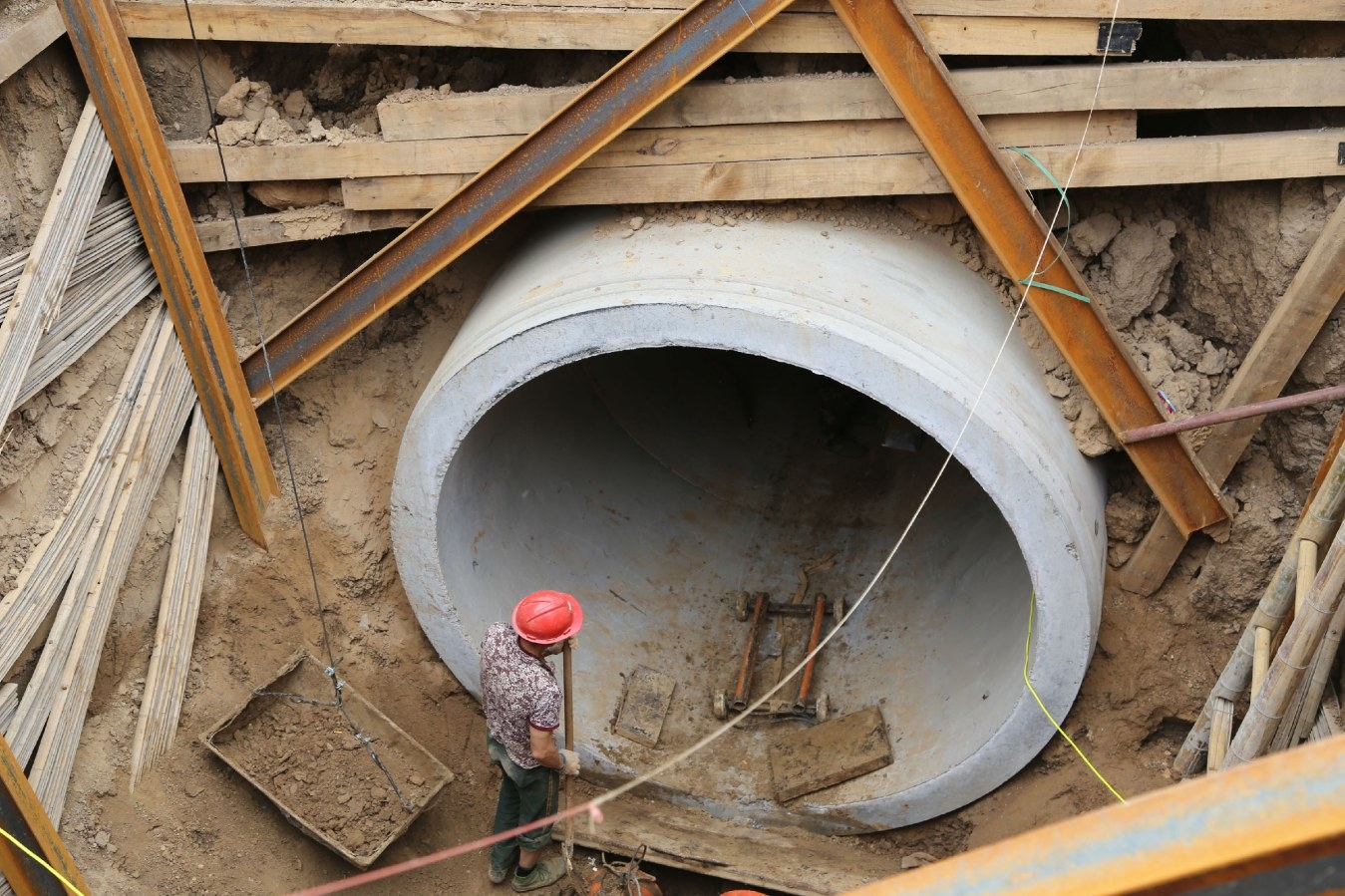 5月11日10时30分,在建安大道与文峰路交叉口以东,施工人员正在一个大型作业坑内铺设管道(如图)。