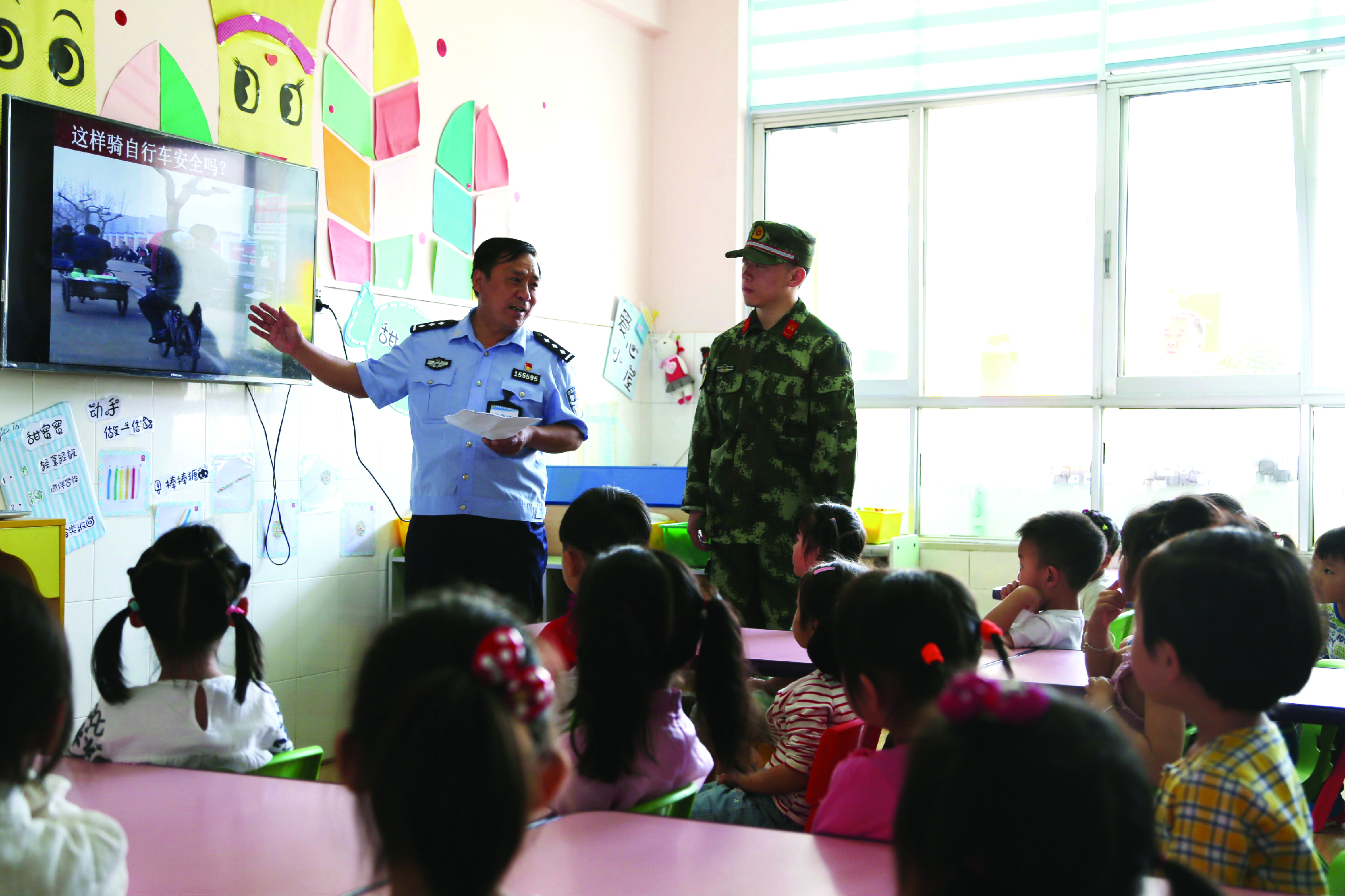 本报讯 (记者 薛炎 文/图) 5月17日,市公安局北大派出所府后社区民警联合魏都区消防大队的消防队员,一起为辖区多所学校及幼儿园的孩子们上了一堂生动有趣的交通安全和消防知识课(如图)。