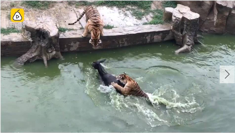 6月5日,江苏常州淹城野生动物园内,一头活驴被扔进老虎池。两只老虎立即咬住驴的脖子,驴在挣扎大约30分钟后死亡。据该动物园一名员工介绍,驴并不是动物园给老虎投喂的。“扔动物的是股东,内部有矛盾。”这名员工表示,目前具体原因及事件情况,公司正在调查。现快/图