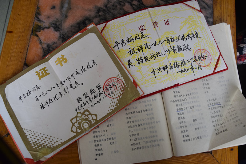 在居委会工作12年后,牛秀梅被调到许昌市橡胶二厂任后勤科科长,后来到车间工作,担任车间党支部书记。牛秀梅保存的一份许昌市橡胶二厂的名录上清晰地记载着:“牛秀梅(女),党员,车间支部书记。”在她珍藏的一个大铁盒中,记者还见到了两本牛秀梅同志被评为优秀共产党员的证书,日期分别为1988年和1991年,落款是中共许昌市橡胶二厂委员会。