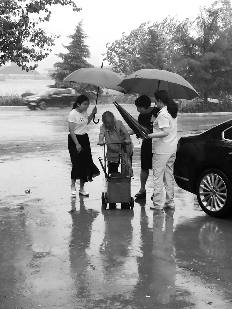 雨中发现无助老人,驾车将其护送回家