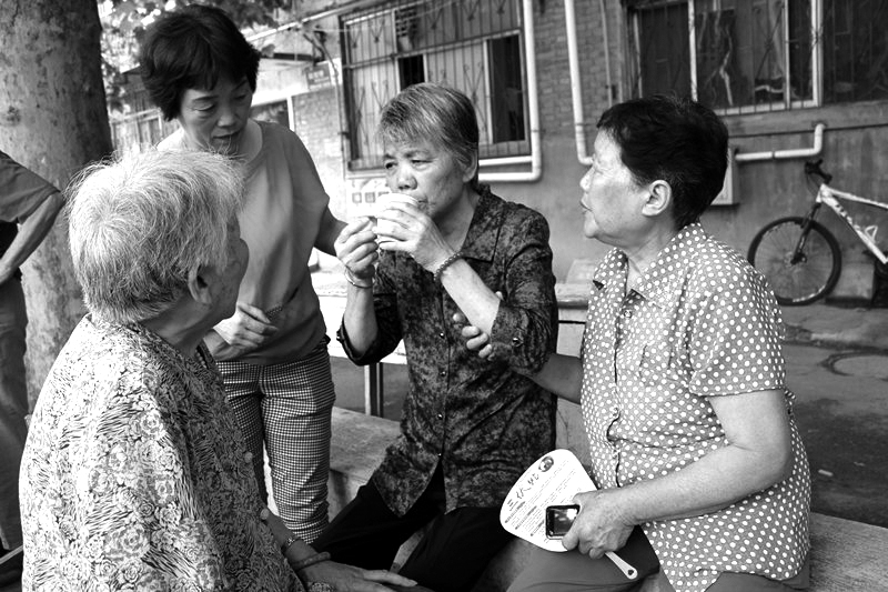 70多岁的社区居民赵玉甫一直在老太太身边,陪她聊天儿,给她端茶倒水,连午饭都没有时间做。老太太一会儿说一句要找儿子,抓着赵玉甫的胳膊不松手,还抓出了一道印子,但赵玉甫始终没有生气。