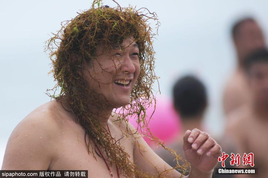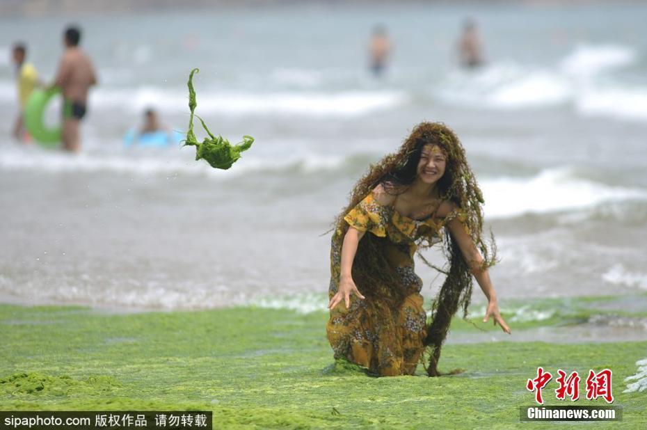 浒苔来袭,游客海滩开“化装舞会”