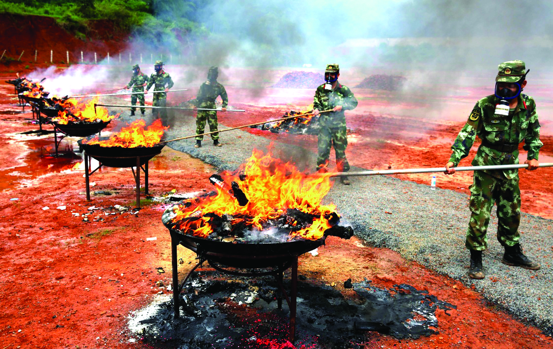 6月26日,云南德宏边防官兵在芒市公开销毁毒品。当日是第30个国际禁毒日,云南省德宏傣族景颇族自治州在芒市举行毒品集中销毁活动,现场销毁缴获的各类毒品5.635吨。新华社发