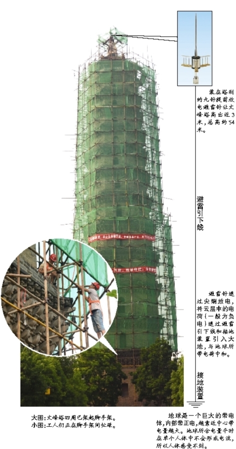 “九针提前放电避雷针类似于不锈钢管,尖端分出3个‘小翅膀’,每个‘小翅膀’上有3个小避雷针!”朱雪瑞介绍,它被设置在文峰塔尖端,让文峰塔高出了近3米,总高约54米。“该设施通过4根避雷引下线与一、三、五层塔身设置的避雷带相连,从而构成一个完整的保护设施。避雷带为纯铜材质,耐腐蚀性强,用三五十年不成问题!”朱雪瑞说。