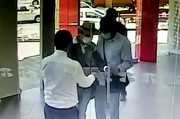 该银行监控系统拍摄的短片显示,在三名蒙面男子头戴鸭舌帽穿过第一道门后,保安不慌不忙地锁上第二道门,破坏了劫匪的抢劫计划。三名劫匪死死地盯着保安,迟疑了一会儿后扬长而去。