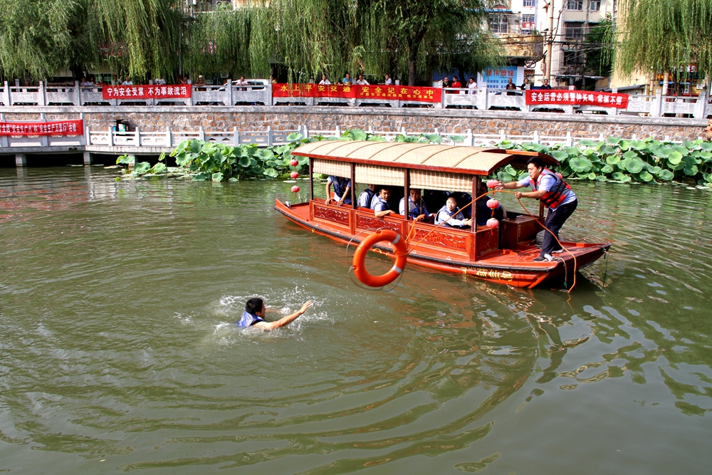 “此次共有4艘9.8米长仿古电动画舫、2艘电动观光摇橹船和1艘巡逻救援快艇参与了演练。”现场,市地方海事局的工作人员告诉记者,如今,许昌由一座缺水城市变成了河畅、水清的北方水乡,特别是城内的护城河,还通了水上公交供市民乘坐游玩。水多了,危险不能忽视。因此,我市特按照国家安全生产法和内河交通安全管理条例的要求,结合水上运营特点和护城河航道的实际情况,组织了2017水上交通应急救援演练。