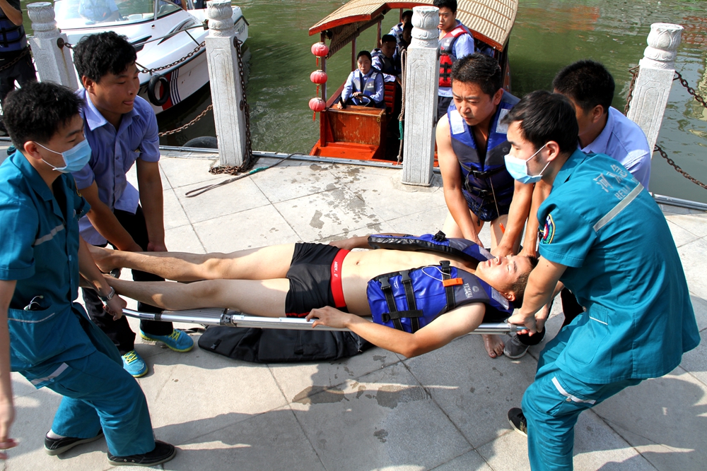当日上午8时30分,演练正式开始。第一个演练科目便是人员落水应急救援,也就是文章开头描述的情景。水上公交采莲号载客10人,正常行驶至南护城河段瑞贝卡停靠点附近时,发现有人落水,情况紧急。船长通过对讲机向调度中心上报并通知安全员实施救援。调度中心值班人员接到报告后,立即启动应急预案,通知应急救援组增援。应急救援组赶到后,与采莲号上的工作人员一同将落水者救起并送上岸。接到通知赶来的120急救人员对落水者进行抢救,演练完毕。