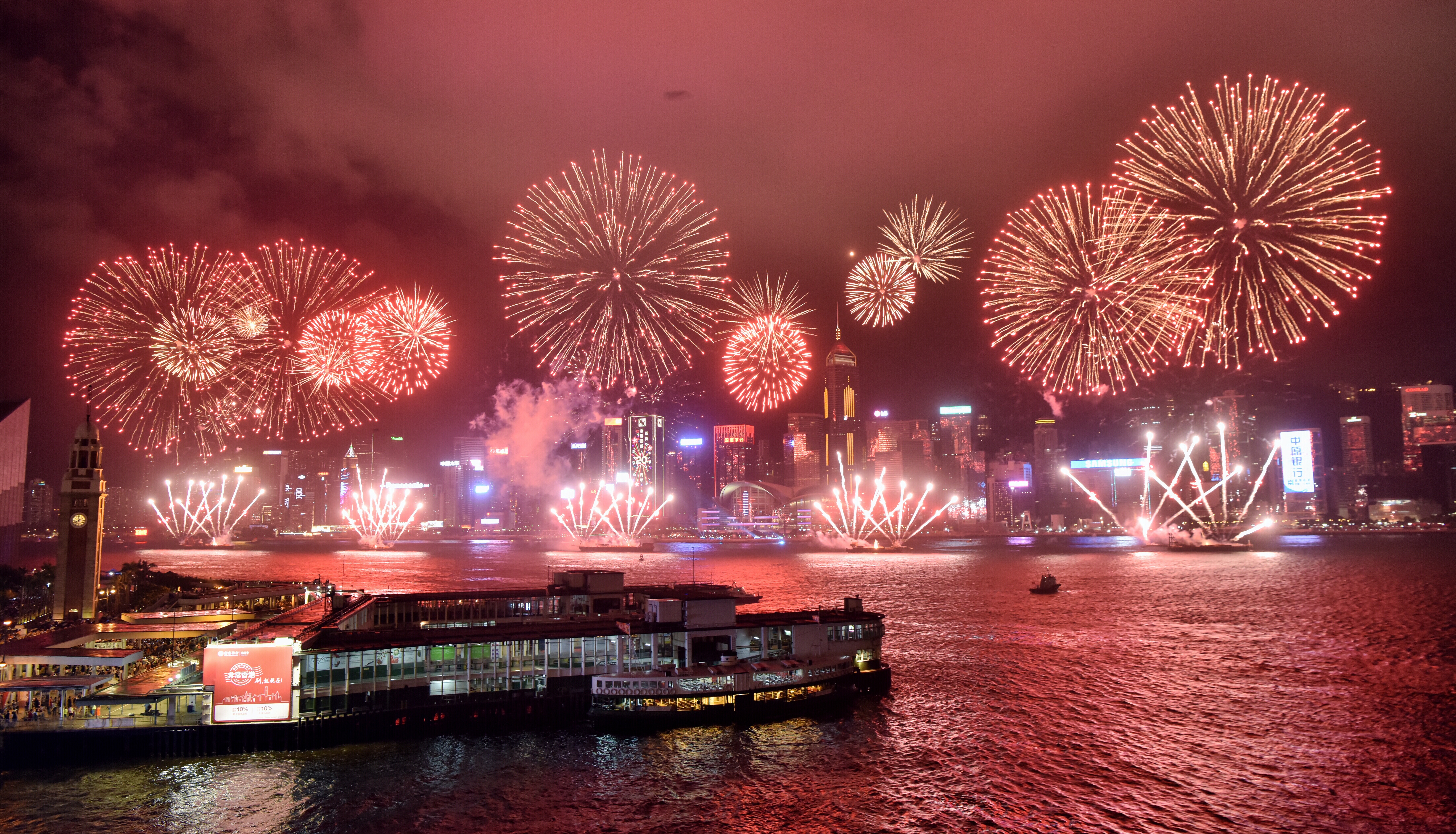 7月1日,烟花在维多利亚港上空“绽放”。当晚,香港举行大型烟花会演,庆祝回归祖国20周年。 新华社发