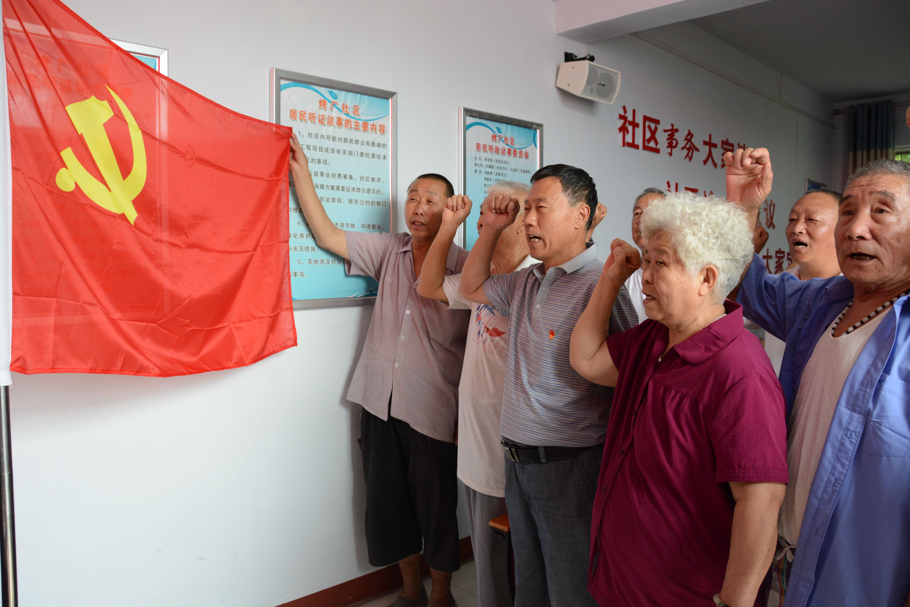 → 7月1日,在魏都区西关街道办事处烤厂社区,83岁的老党员牛秀梅(前一)与该社区党员代表一起重温入党誓词。