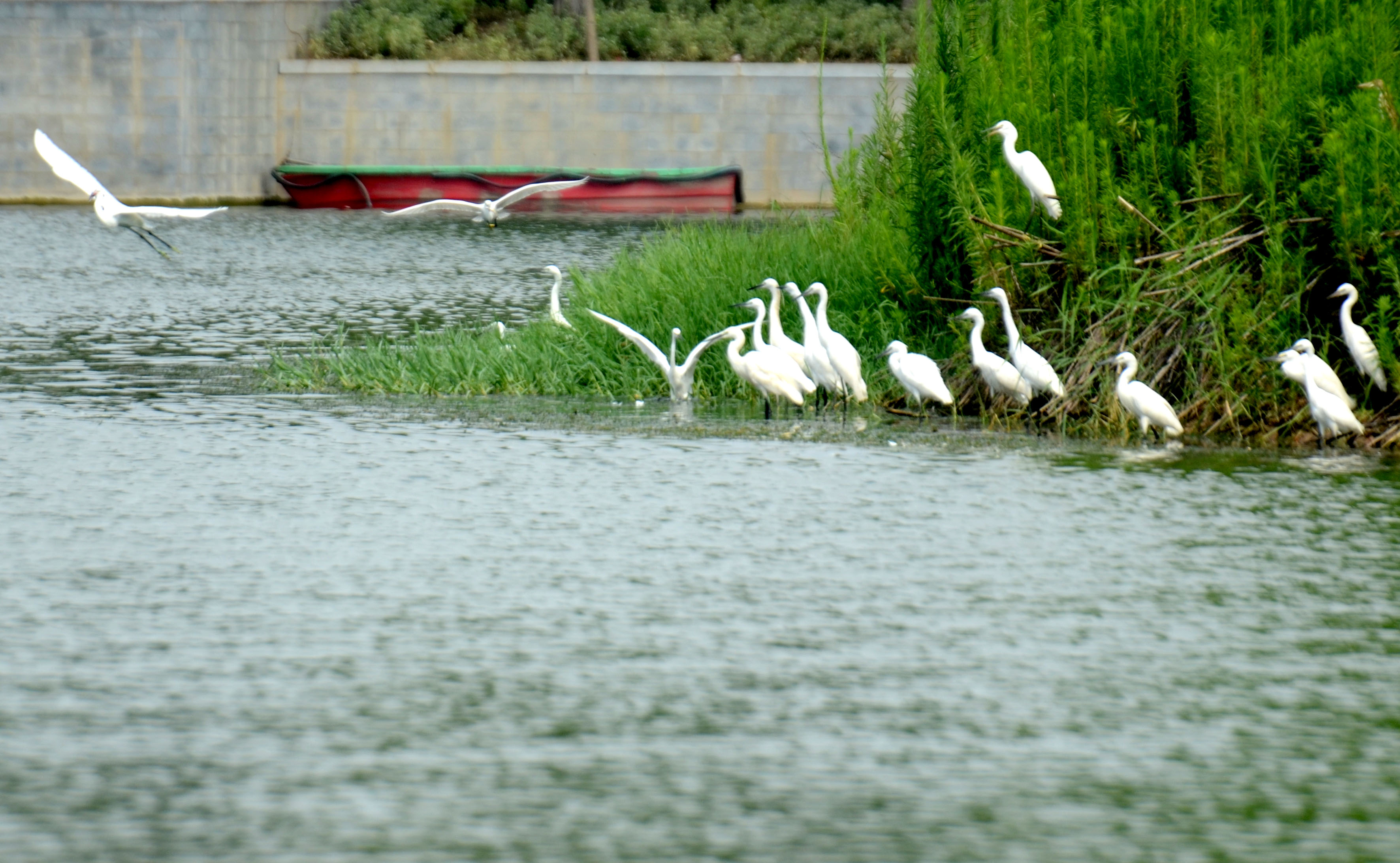 7月20日,市区秋湖湿地,成群的白鹭在水边栖息、飞翔。如今,我市构建了“五湖四海畔三川,两环一水绕莲城”的水系格局,满足了人们休闲、观赏和娱乐之需,也为各种鸟类提供了栖息地。人们在我市水系周边见到的水鸟种类及数量越来越多,它们为莲城水系美景增添了一抹亮色。 记者 牛志勇 摄