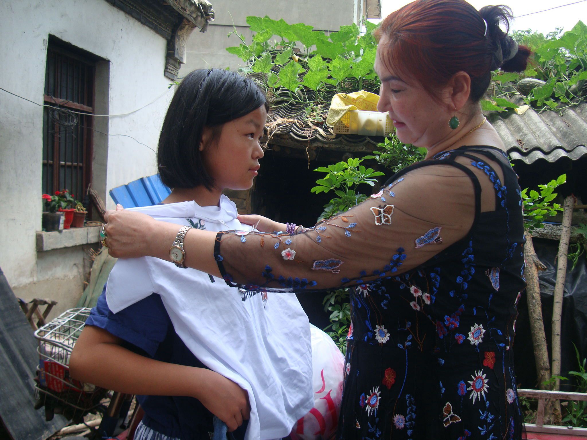 本报讯 (记者 张莉莉 文/图) 7月18日,市民帕提古丽带着食用油、大米、学习用品和两套新衣服到襄城县紫云镇刘楼村,看望贫困女童林怡彤。这是她第三次趁着暑期给林怡彤送去贴心的“母爱”。