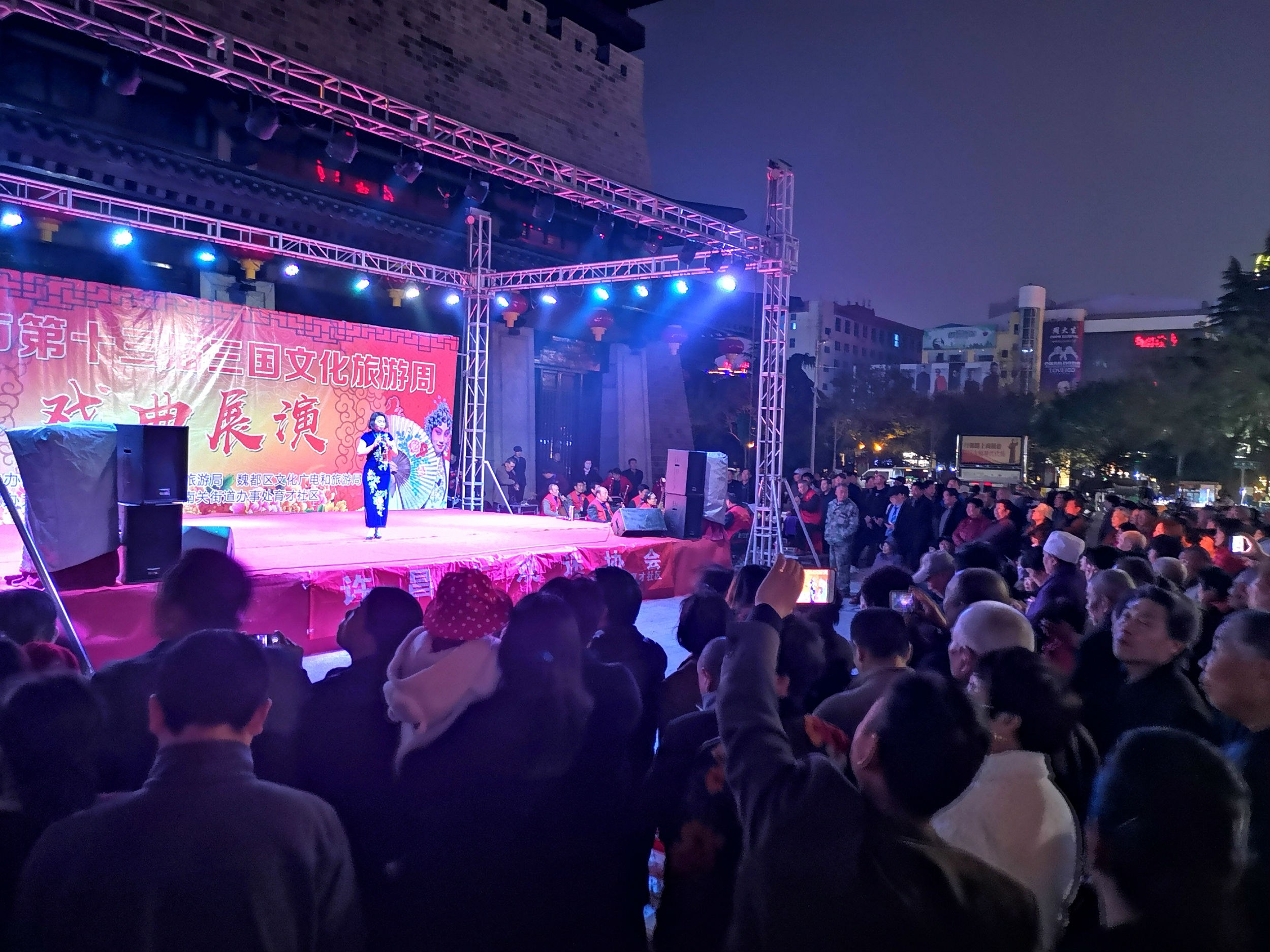 4月12日晚,市区建设路曹魏古城南城门前,精彩的戏曲展演吸引了众多市民前来观看。记者 陈晨 摄
