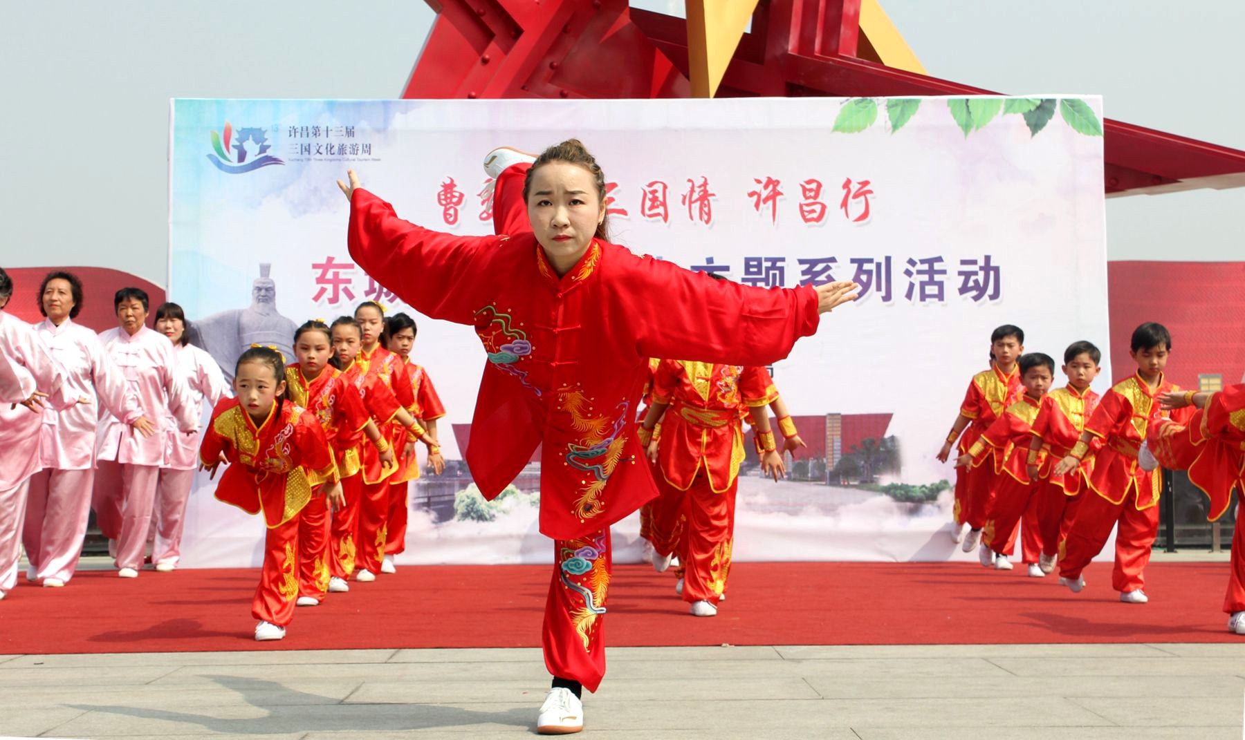 当日,东城区在这里举行三国文化主题系列活动,演员们表演了诗歌朗诵、舞蹈、武术等节目。五禽戏是中国传统的养生功法,为汉代名医华佗所创。许昌是三国文化名城,五禽戏在许昌有着广泛的群众基础。记者 贾同岭 摄