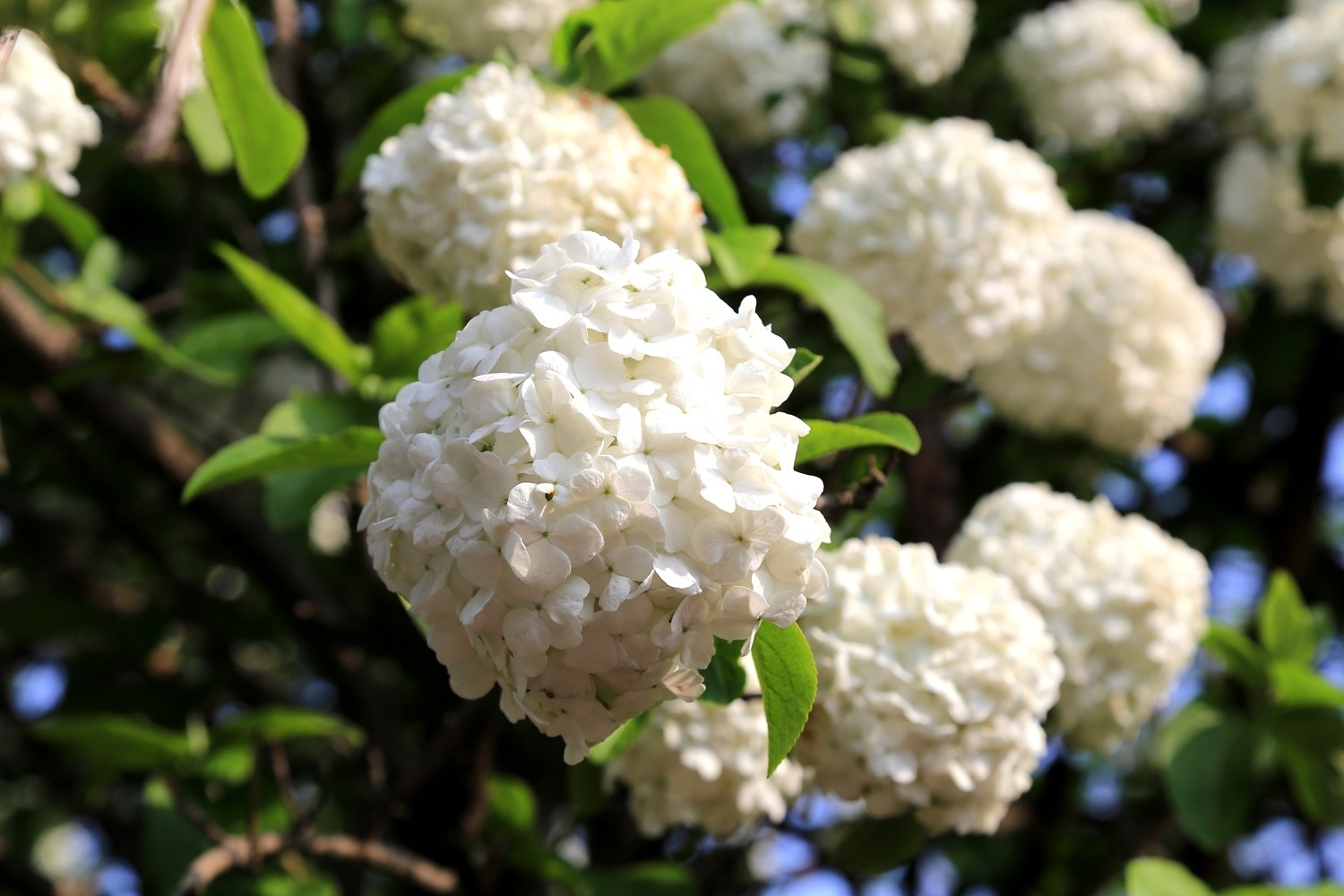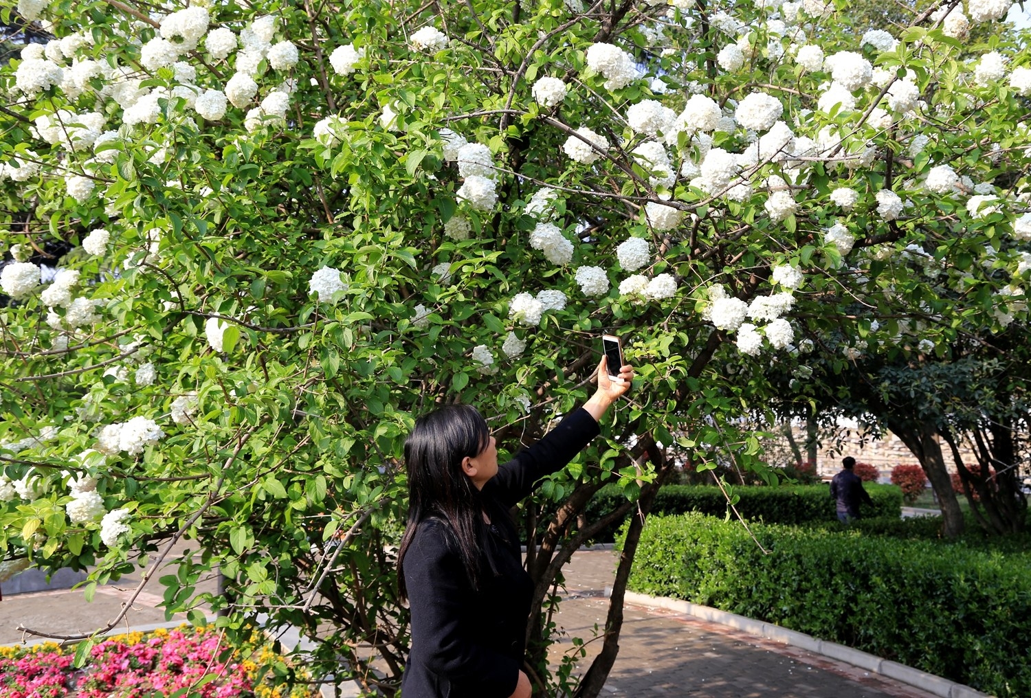 西湖公园的工作人员介绍,这几棵乔木是木本绣球,别名斗球、木绣球,属于忍冬科荚蒾属,开花后花团锦簇,如雪花压树,故有“雪球”之名。如今,其正值盛花期,喜欢的花友可前来观赏。
