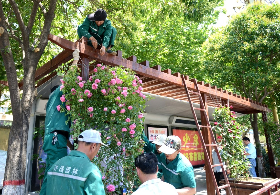 当日10时许,建安大道东段一处公交候车亭,几名园林工人合力抬着一盆藤本月季往防腐木花箱内放置。工人吴延立麻利地顺着梯子爬上公交候车亭顶棚,用铁丝将藤本月季的枝蔓固定好。12时许,3盆藤本月季栽好了。