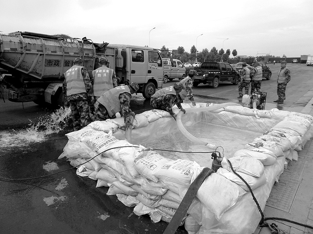 此次演练由市供排水监管中心、市河湖水系水源调度中心和市市政实业有限公司共同举行,旨在检验防汛应急预案和措施的可行性,锻炼队伍,强化各级各部门的应急协调机制,提高实战能力。图为抢险人员抽取模拟积水点的积水。