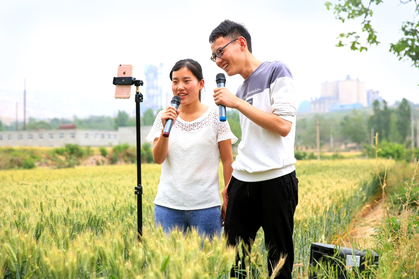 这是禹州市浅井镇陈垌村“网红”小夫妻——陈高峰和段浩浩在麦田里进行手机直播。5月16日上午,记者看到,不到一个小时,陈高峰拍摄的视频播放量超过了一万次。