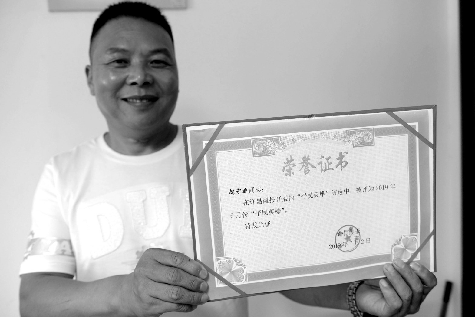 本报讯 (记者 毛迎) 为激励广大群众崇德向善,营造良好的社会氛围,我市把精神文明建设融入群众的日常生活,不断提升公民的文明素质和社会的文明程度,在“看许昌好人、学许昌好人、当许昌好人”浓厚氛围的熏陶下,爱岗敬业、助人为乐、诚信友善、见义勇为等意识日益深入人心,涌现出了一大批感人至深的善行义举。本报持续聚焦你我身边的“平民英雄”,并开通了微信投票渠道,请读者为这些“平民英雄”投票。经过读者投票,热衷公益事业的赵守业当选为6月份的“月英雄”。7月7日,赵守业获得本报为其颁发的荣誉证书。