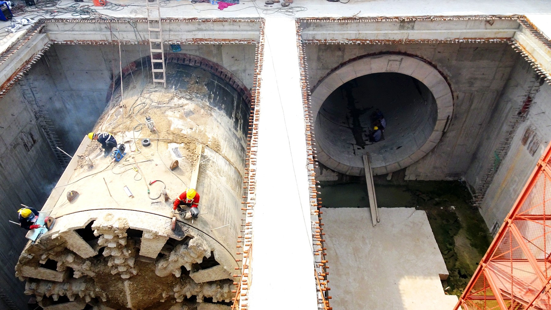 基坑南侧的混凝土墙上,圆形隧道口已经修葺完毕,装上了一个混凝土圆环。