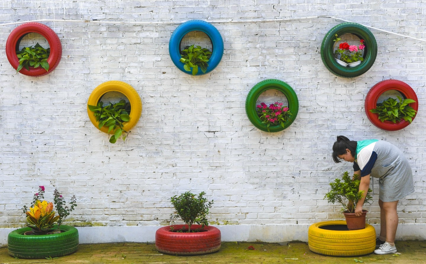 8月27日,河北省故城县郑口镇翟庄村村民在用废旧轮胎装扮自家庭院。