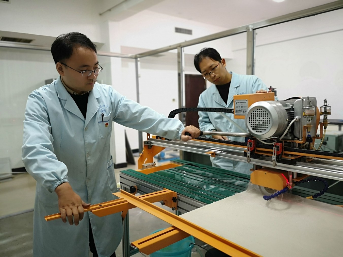 任可用和朱勇宾取出一块陶瓷砖样品进行检测。先用干燥箱对样品进行干燥。完成后,将样品固定在断裂模数检测仪上,然后操作仪器向样品缓慢施加压力。待样品断裂时,记录断裂负荷。然后分别用断裂模数和破坏强度公式进行计算。