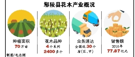 李新江介绍,目前,该县花木种植面积达70万亩,花木品种有绿化苗木、盆景盆花、鲜花切花、草皮草毯4个系列2400多个,产品销售覆盖全国近30个省(区、市),成为名副其实的“中国花木第一县”、全国最大的花木集散地。仅2018年,该县花木销售额就达77.87亿元,花木主产区人均纯收入达3.17万元。