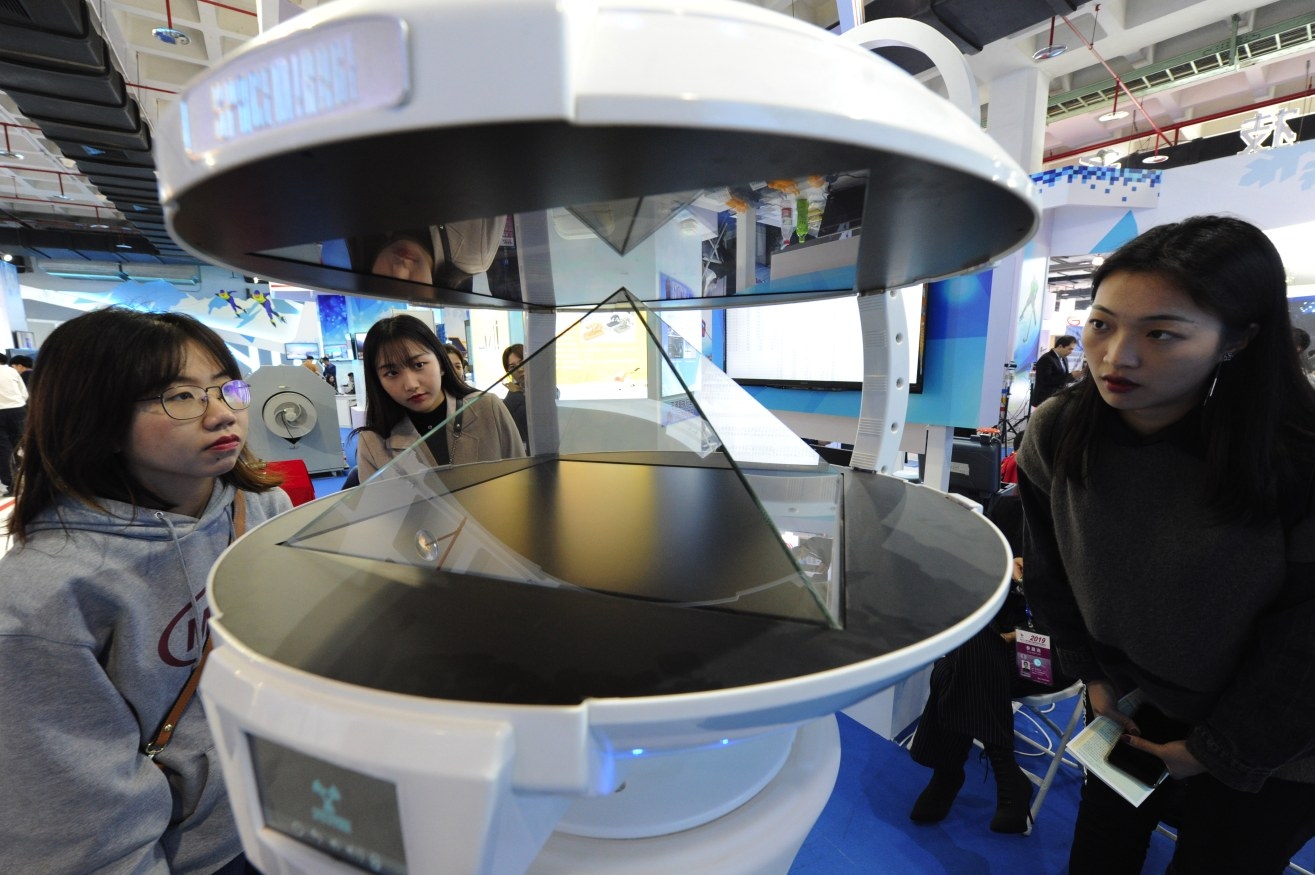 10月24日,参观者在观看360度裸眼3D全息投影仪。当日,第二十二届科博会在位于北京的中国国际展览中心(老馆)开幕,参展企业有1200余家。新华社发