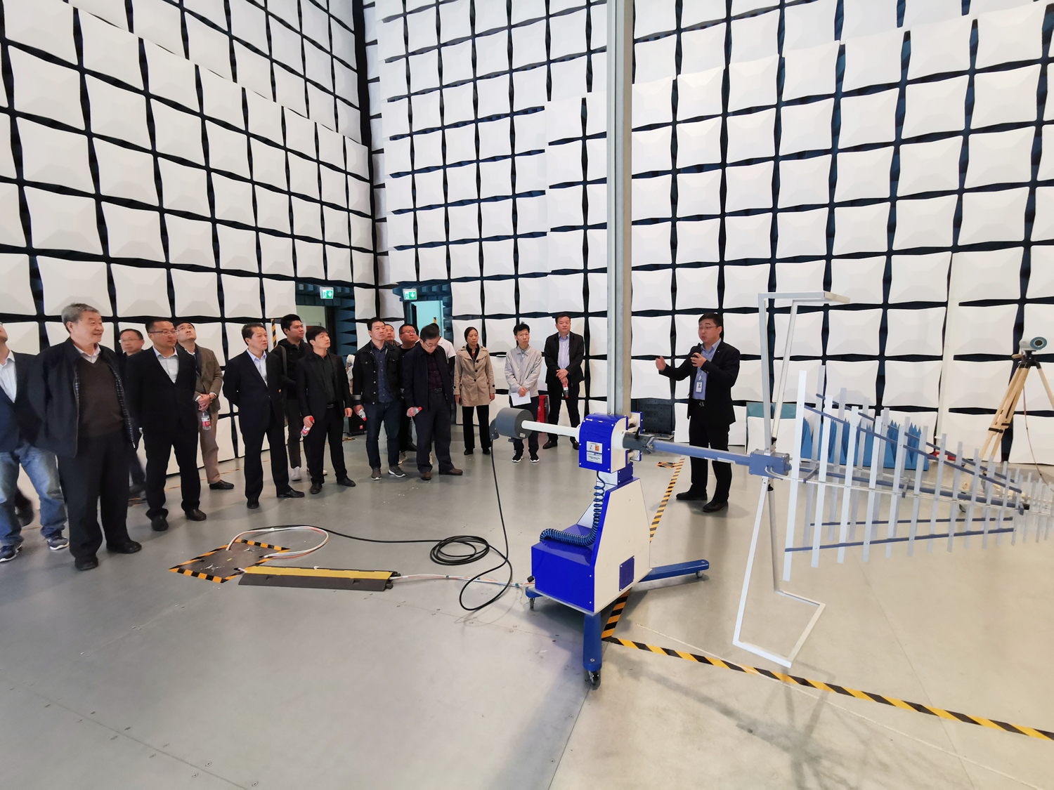 10月27日,参会嘉宾参观开普检测电磁兼容试验研究中心10米法电波暗室。长22.5米、宽16.5米、高8米的超大空间让人格外震撼。记者 陈晨 摄
