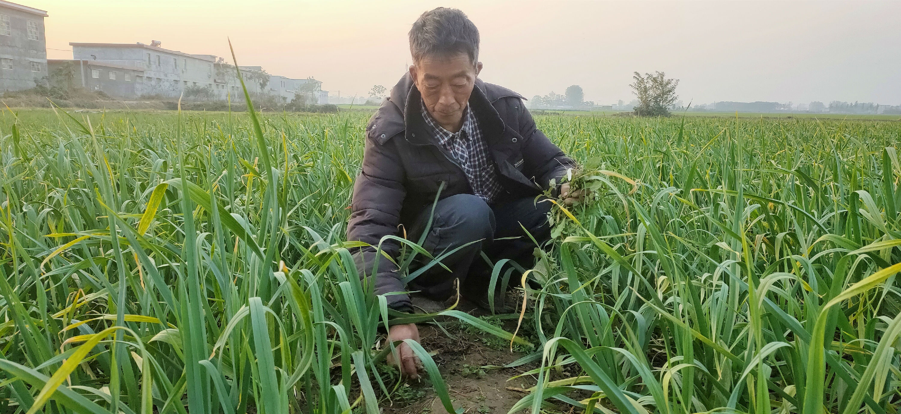 11月4日,在袁庄村的一块田地里,袁付才正在给蒜苗拔草。
