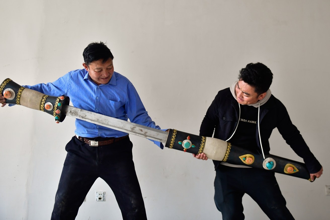 11月17日,芒擦藏刀匠人更求彭措(左)与外甥才仁战斗将一把大型藏刀装入刀鞘。