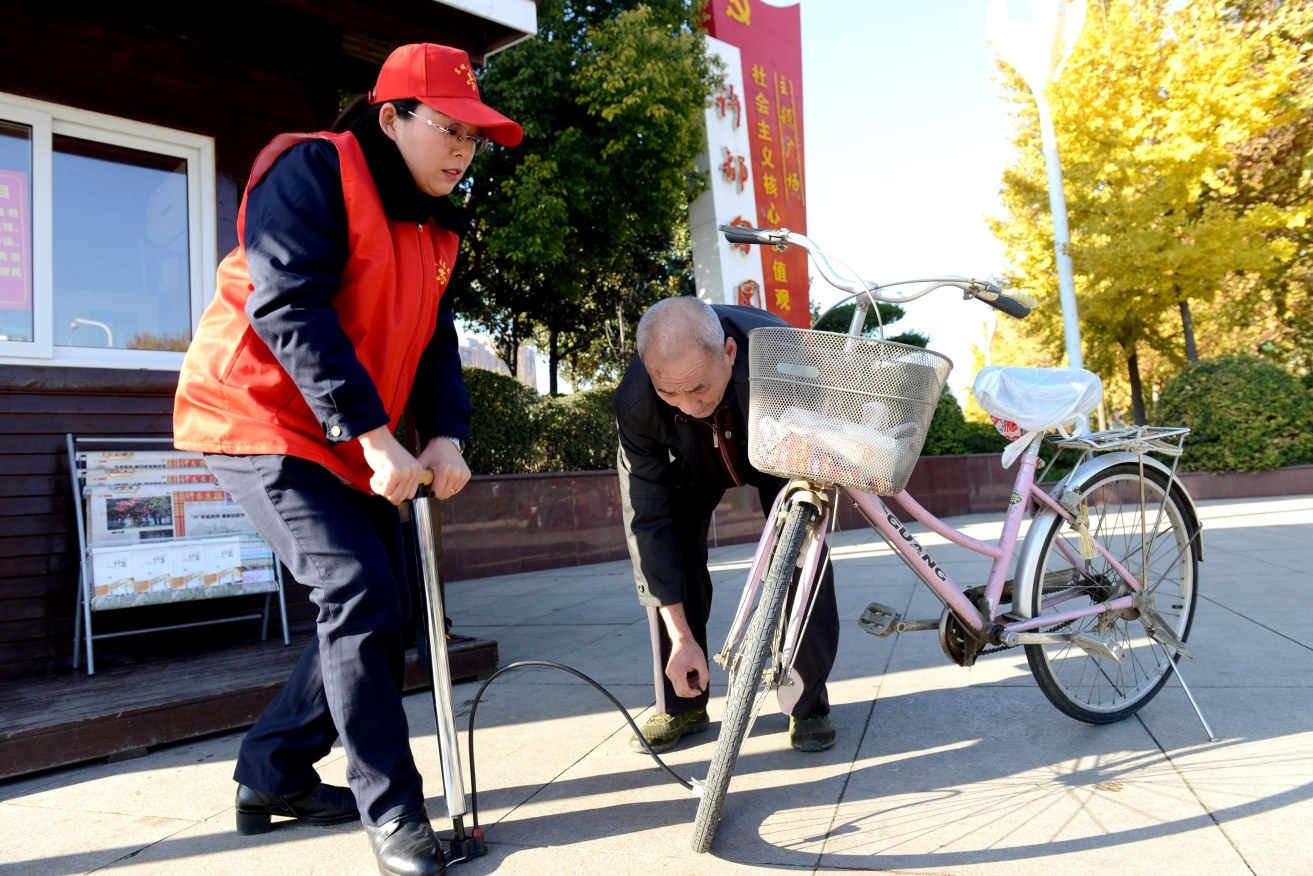 12月3日,东城区许都公园志愿服务站,志愿者杨利在帮助市民打气。分布在许都公园、科技广场、春秋广场等处的志愿服务站,免费为群众提供急救药品、针线等物品及失物招领、问路咨询、打气等便民服务,深受市民好评。 记者 牛志勇 摄