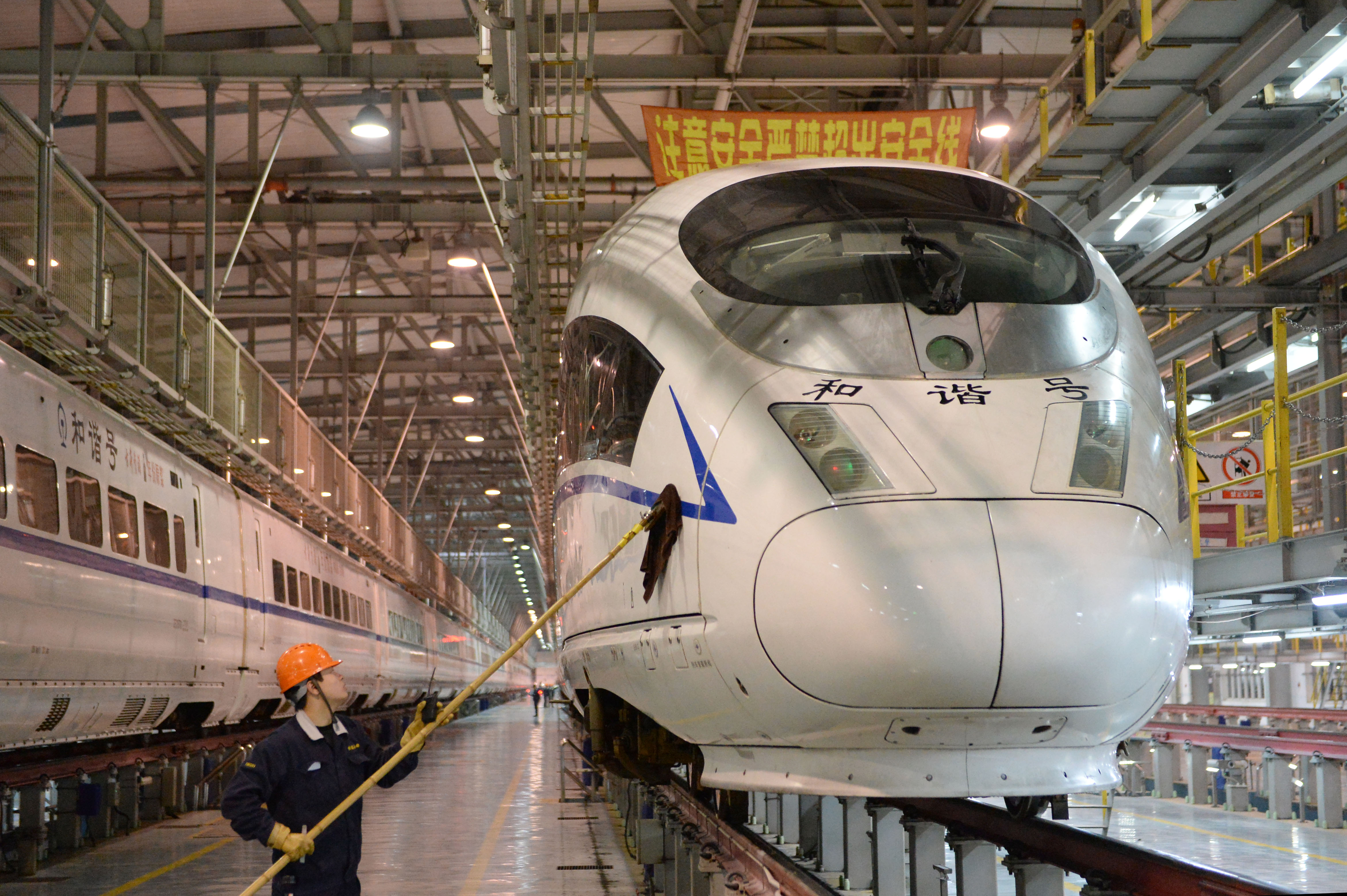 2019年12月31日晚,工作人员在清洗动车组。2019年最后一晚,合肥南动车运用所灯火通明,工作人员在跨年夜坚守岗位,对动车组进行全面细致的检修。 新华社发