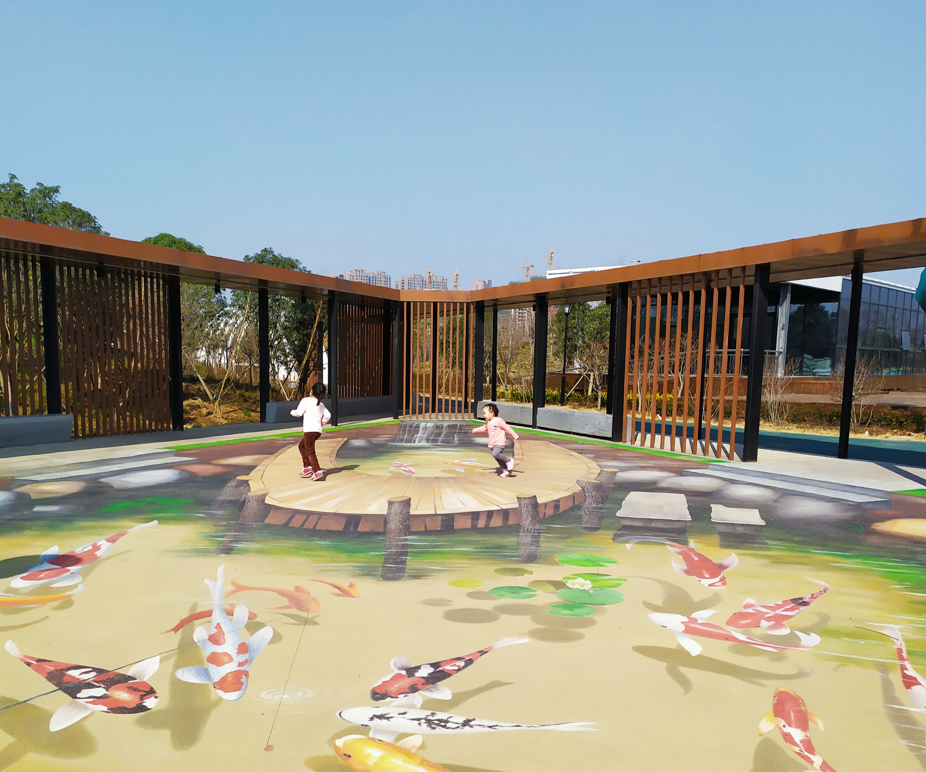 市区公园、游园、广场等地春景如画。3月18日上午,在中央公园,两名小朋友被地面上的3D画吸引,在画中欢乐地跑来跑去。 记者 万誉 摄