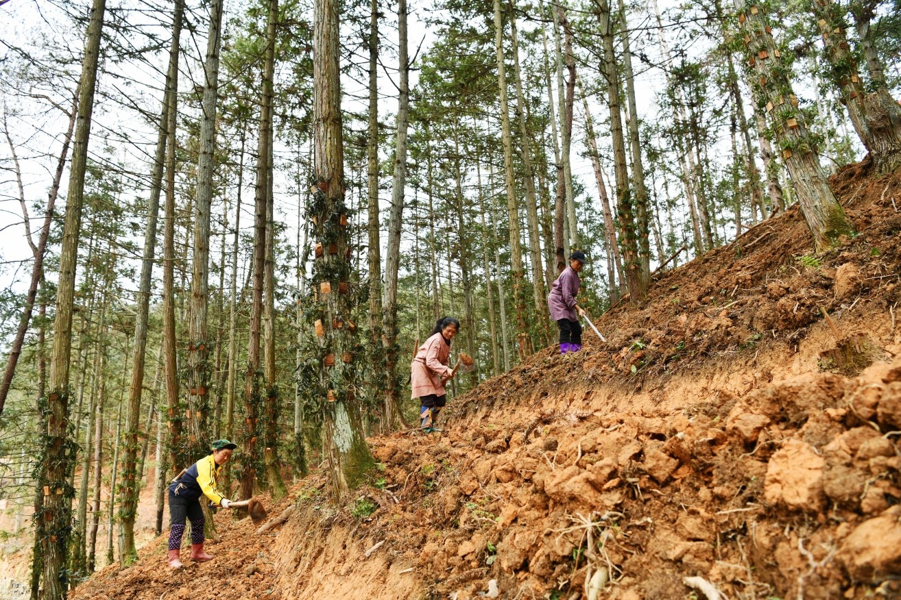 近日,村民在贵州省锦屏县铜鼓——大同万亩林下综合产业示范基地套种淫羊藿。