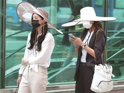 受新冠肺炎疫情影响,韩国政府提出保持“社交距离”的政策。6月26日,一场别开生面的模特儿秀在首尔江南站亮相。模特儿们头戴特殊的防疫帽,提醒群众注意防疫。这种宽大的帽檐设计有助于保持“社交距离”。该帽子携带方便,不使用时可折叠至原大小的15%,设计灵感源于韩国传统书生帽。