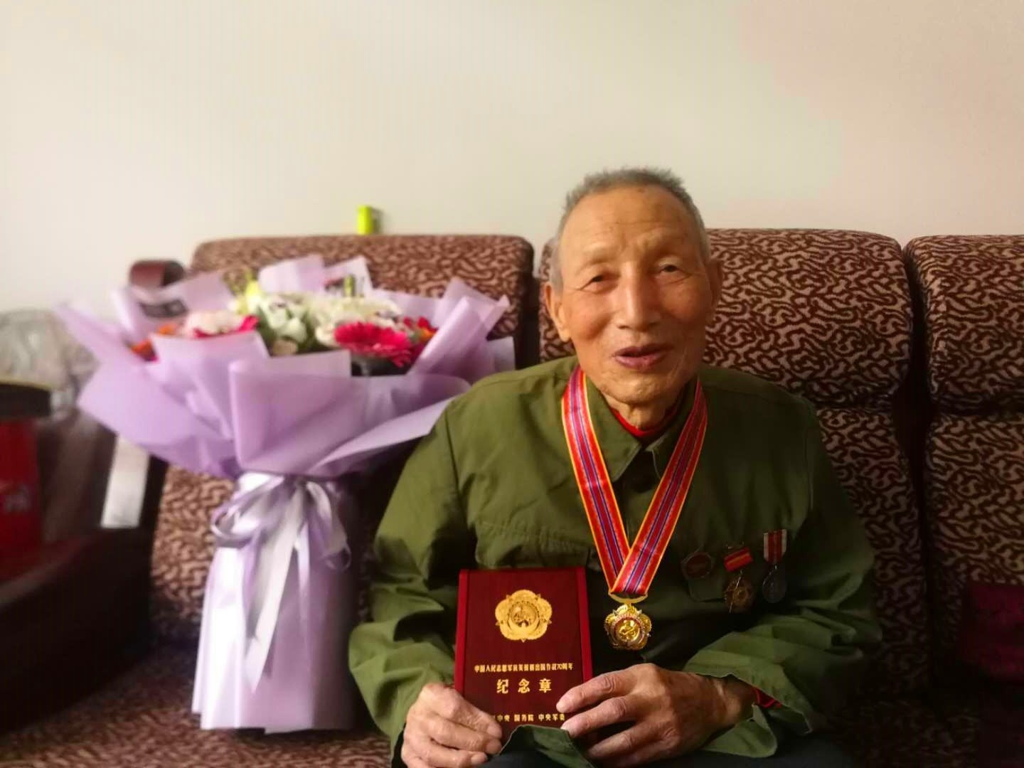 88岁的马德舜收到鲜花和纪念章,脸上露出了灿烂的笑容。1932年出生的马德舜在1952年10月赴朝鲜参加抗美援朝战争,1958年回国,在朝鲜长达6年时间。在朝鲜期间,他与战友一起冒着炮火运送物资。他被中国人民志愿军步兵第一团政治处记三等功一次。《朝鲜停战协定》签订后,马德舜和战友继续在朝鲜进行军事训练。其间,他担任防化指导员,教战友如何戴防毒面具、穿防化服,提高防范化学武器的能力,直到1958年回到国内。