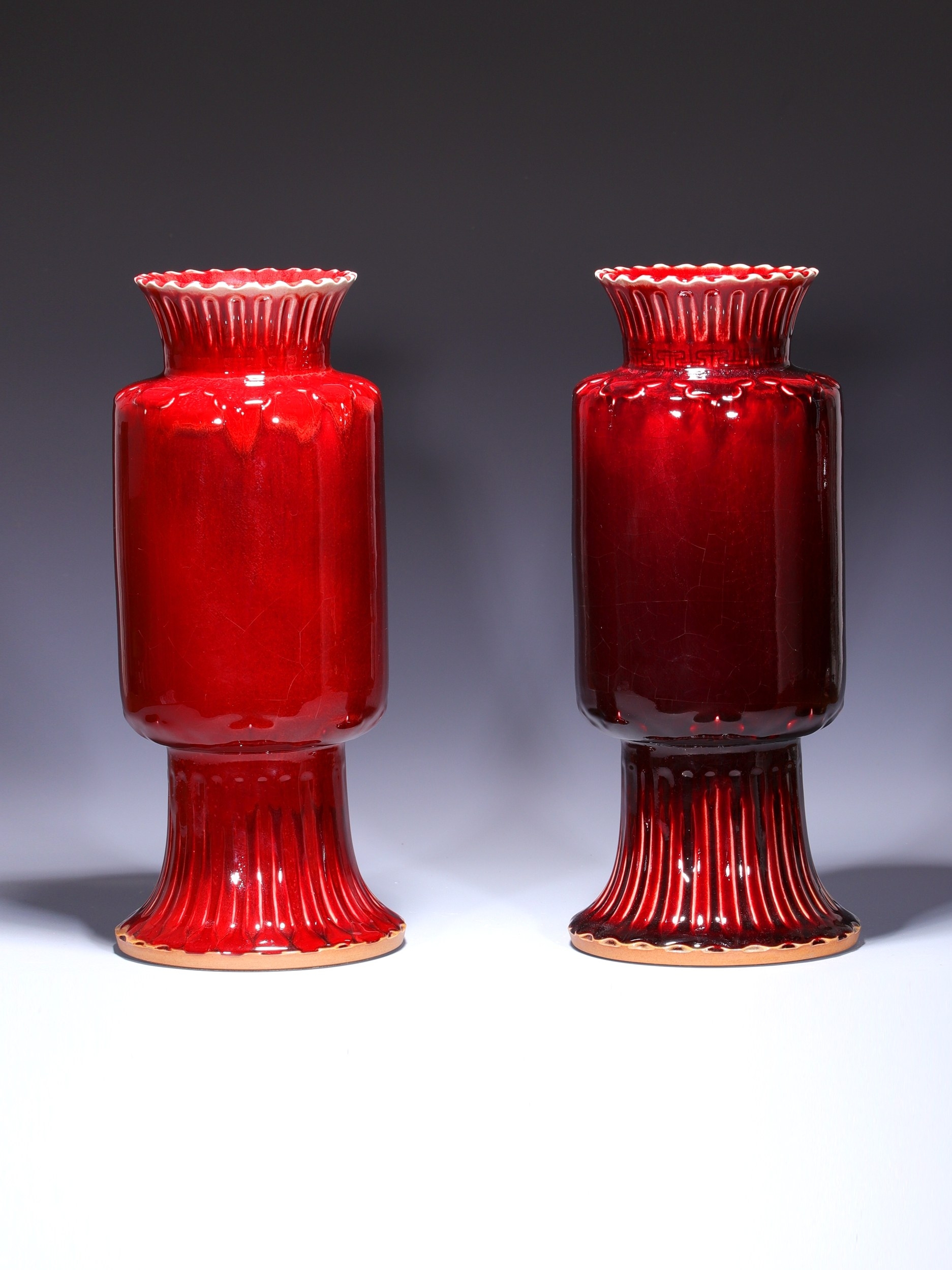 卢家世代钧窑以传统大红灯笼为蓝本,经过艺术加工,呈现出线条流畅、棱角分明的艺术美感。作品上部和下部分别刻有回纹图案,赋予作品连绵不断、吉利永长的吉祥寓意;以钧红釉为色彩装饰,表达了红红火火的美好寓意。该作品以两件为一组,寓意好事成双、福寿双全、双喜临门。