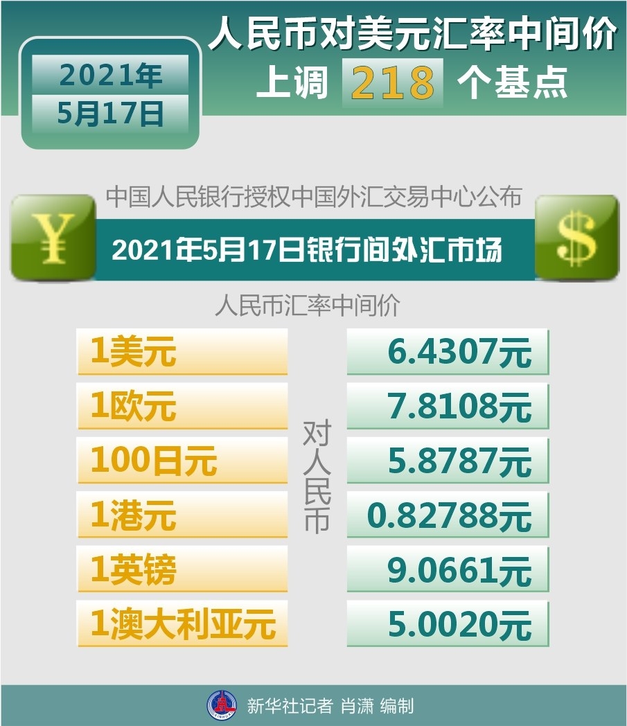 5月17日,人民币对美元汇率中间价上调218个基点。 新华社发