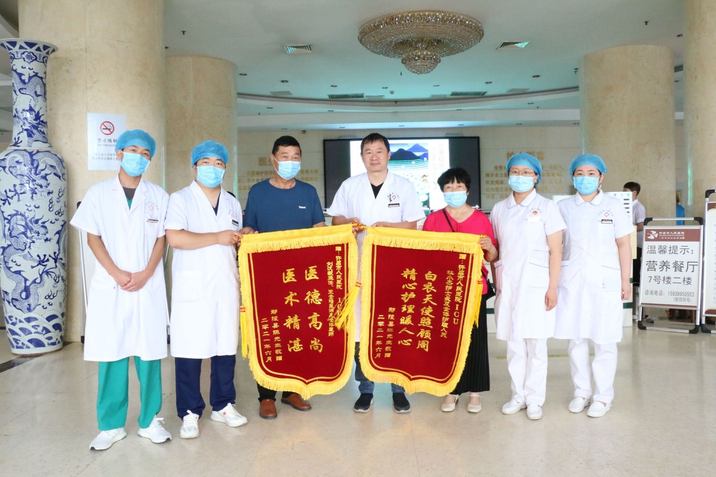 经过半年多的康复,陈先生的肢体活动恢复了正常,除了言语不利索外,不影响正常生活。陈先生非常感激许昌市人民医院ICU的医护人员对他的付出和帮助,于是和家人一起给该科送了两面锦旗,一面锦旗献给该科主任刘汉毅、主治医师王金墙及全体医师,上书“医德高尚,医术精湛”;另一面锦旗献给该科护士长杜小杰及全体护理人员,上书“白衣天使照顾周,精心护理暖人心”。