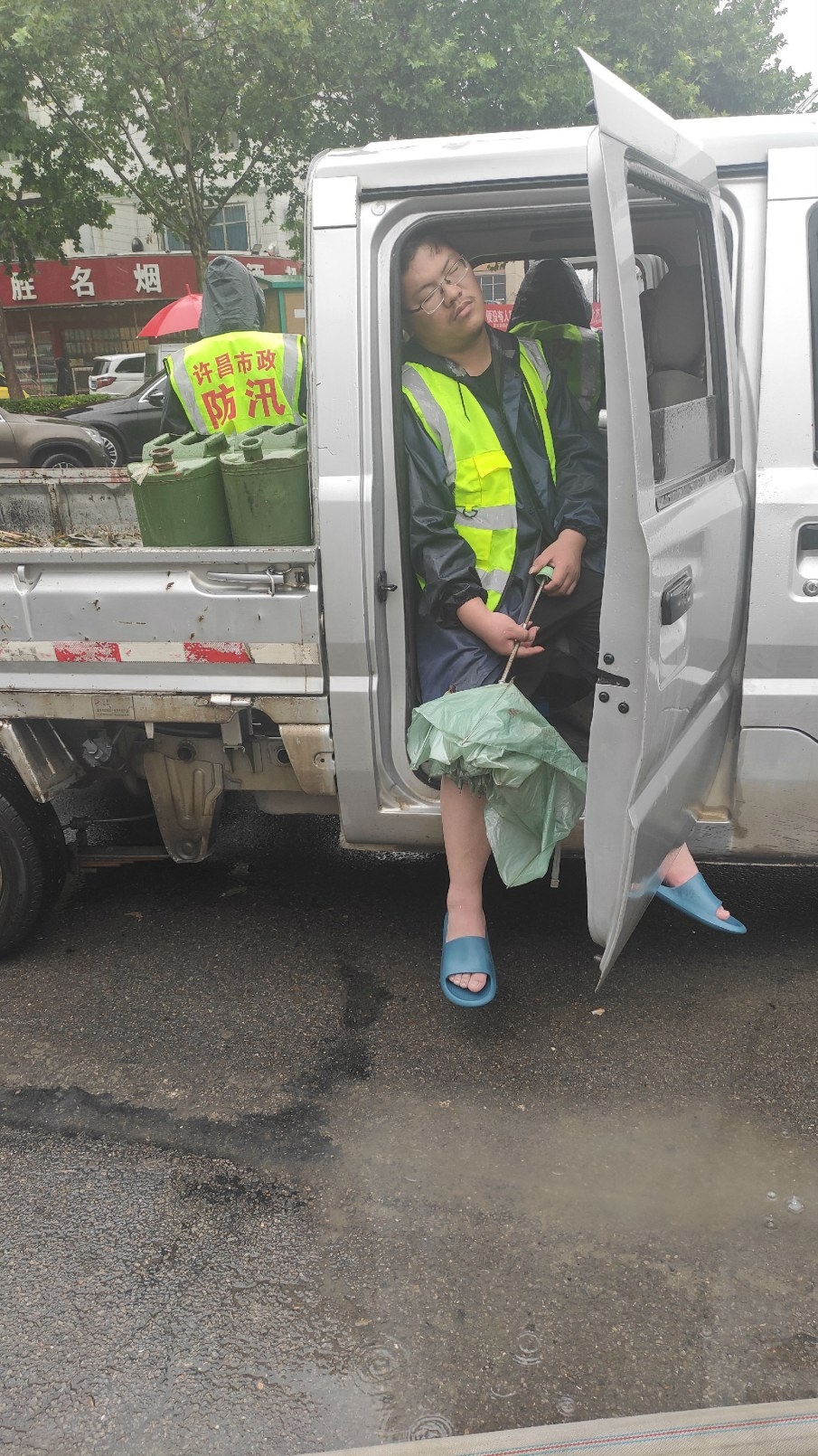 7月21日中午,雨一直在下,记者看到这样一幕:一辆工具车的车厢里,连续工作了27个小时的市政工人王继鹏,换班间隙,在车上“眯”了几分钟。几分钟后,他又投入了紧张的工作!