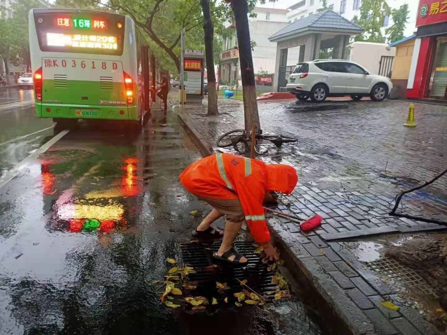 由于暴雨来得急,持续时间相对较长,导致大街上要么是“小溪”,要么是“汪洋”。树叶、树枝、塑料袋等都堵在下水道口,环卫工人冒雨清理下水道口的垃圾。