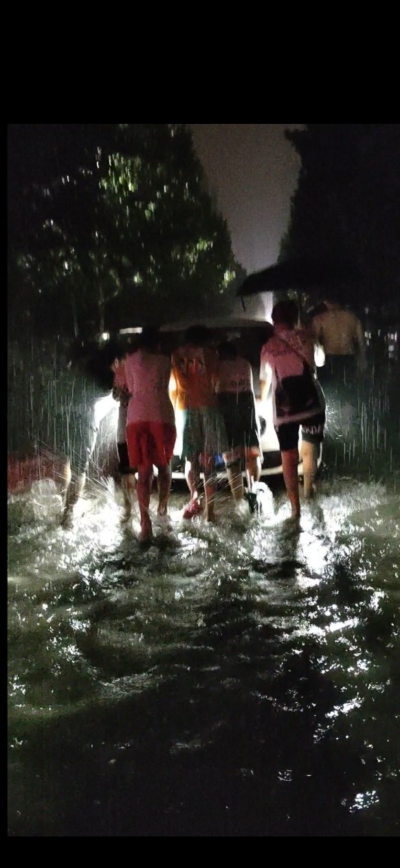 汽车的灯光将如墨一般浓重的夜色“撕”开一道口子,密集的雨点落在浑浊的积水中,荡起一圈圈涟漪。一群少年蹚着积水一边前行,一名少年一边冲汽车司机挥舞着双臂,大声呼喊道:“叔叔,不要过!前面都淹了……”