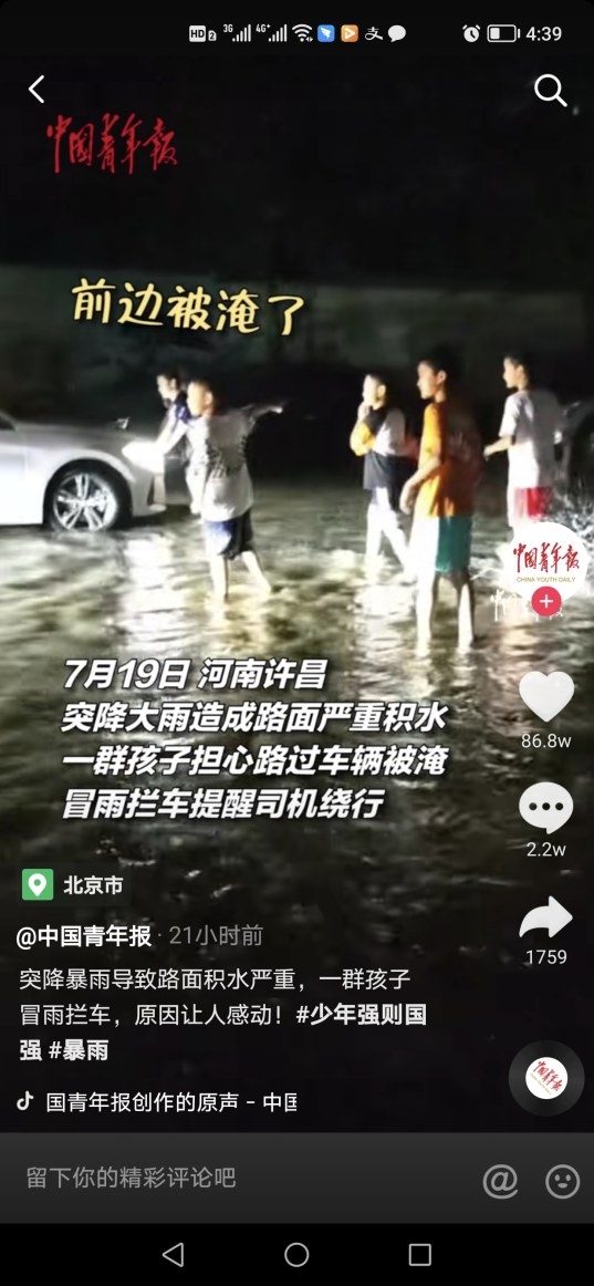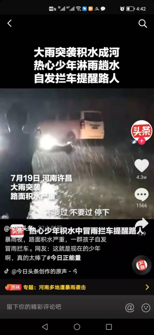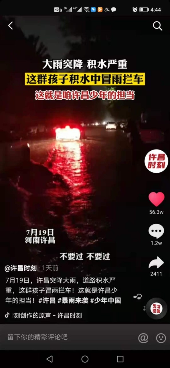 五名少年雨中拦车的一幕无意中“闯”进了记者的镜头。7月19日深夜,许昌报业传媒集团旗下的抖音号许昌时刻以《大雨突降积水严重,这群孩子积水中冒雨拦车,这就是咱许昌少年的担当》为题,推送了一条短视频。一天之内播放量接近1000万次,点赞量达到了56.3万,网友留言1.2万条。