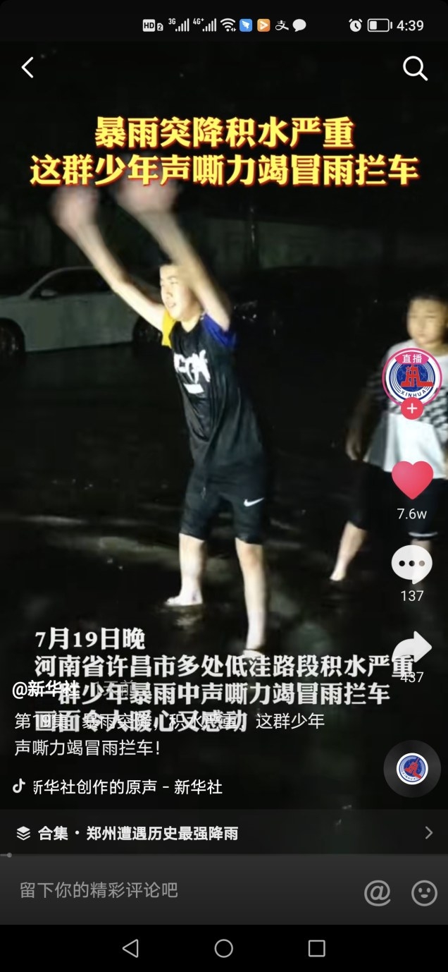 此次河南普降暴雨,受暴雨影响,河南多地出现内涝、洪水,街边车辆被卷走,灾情牵动着全国人民的视线。“暴雨中的河南力量”在抖音平台连续多日登上“热榜”。五名少年在积水中冒雨拦车,这条视频作为“暴雨中的河南力量”系列视频之一,同样持续多日处于“热榜”之上。