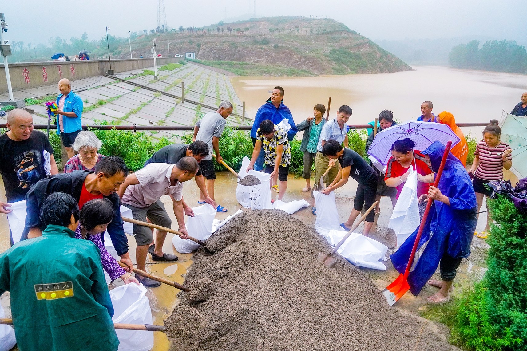 禹州市鸠山镇组织群众加固碧水湾坝体。 签约摄影师 耿亚伟 摄