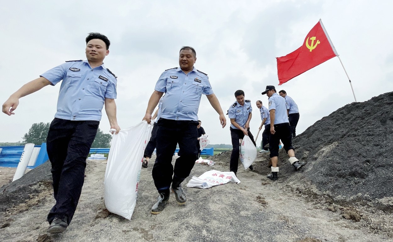 7月23日,鄢陵县公安局民警加固双洎河马坊段河堤。签约摄影师 张晓霞 摄