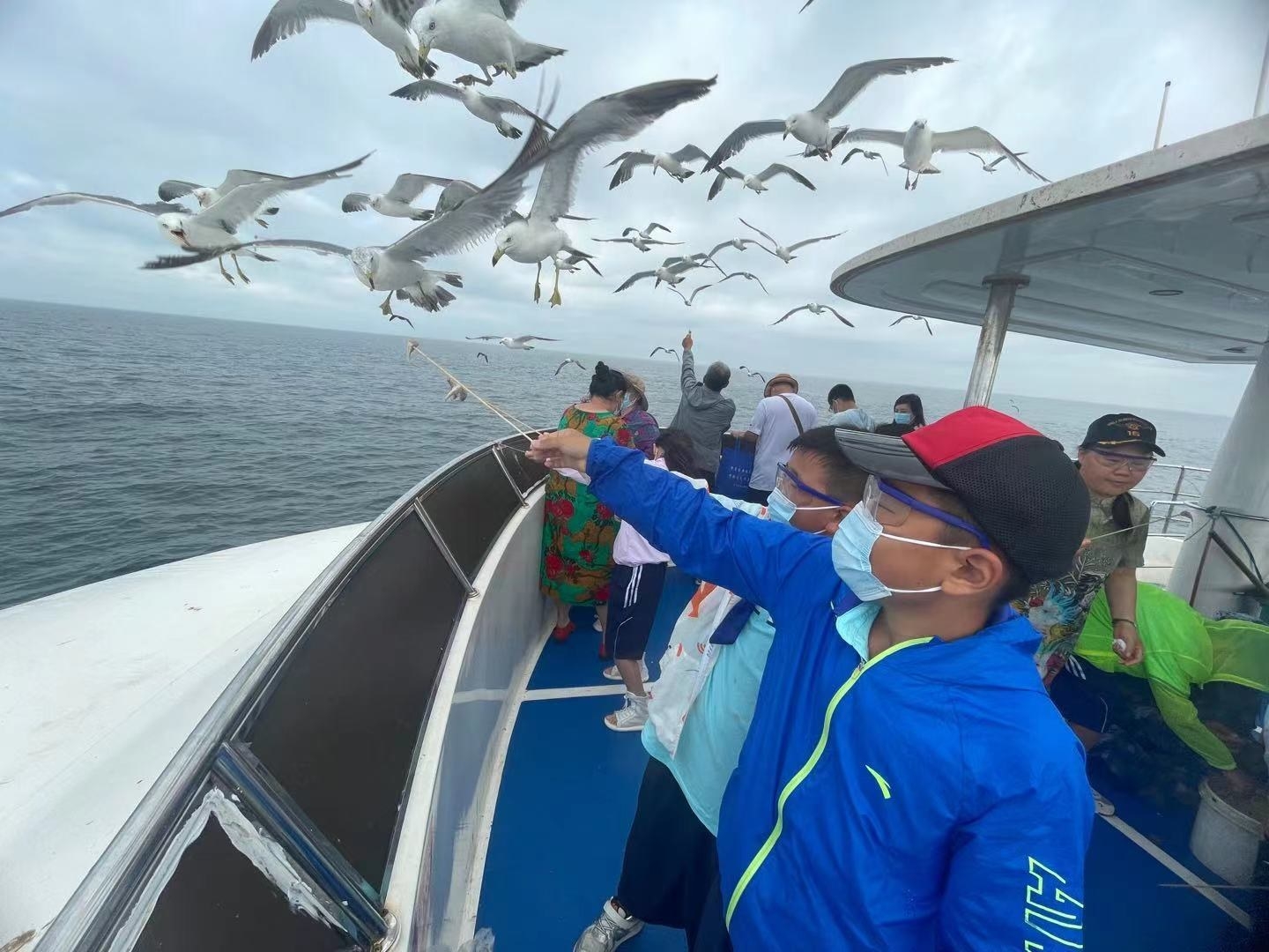 7月21日,2021小记者“海图腾”威海海洋探索研学营第二期顺利返许。小营员们在威海赶海拾贝,品尝海鲜,登上110驱逐舰,体验军旅文化,享受了一段精彩、难忘的欢乐旅程。图为小记者与海鸥亲密接触。 刘晓峰 摄