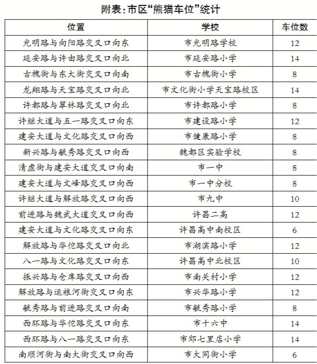 “为缓解家长接送学生停车难的问题,2020年,我们首先在市毓秀路小学门口设置‘熊猫车位’。”范建立说,经过一年的实践,“熊猫车位”反响良好。今年10月,市公安局交管支队又在市区19所中小学门口增设“熊猫车位”。截至目前,全市21所中小学门口共设置了216个“熊猫车位”,每所学校门口分别有6个至14个“熊猫车位”。